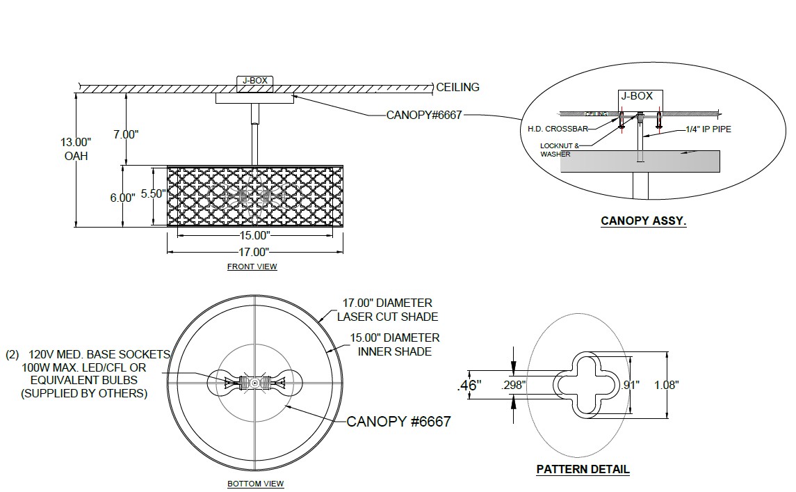 Shade: 17″ x 17″ x 6″ Outer/16″ x 16″ x 6″ inner